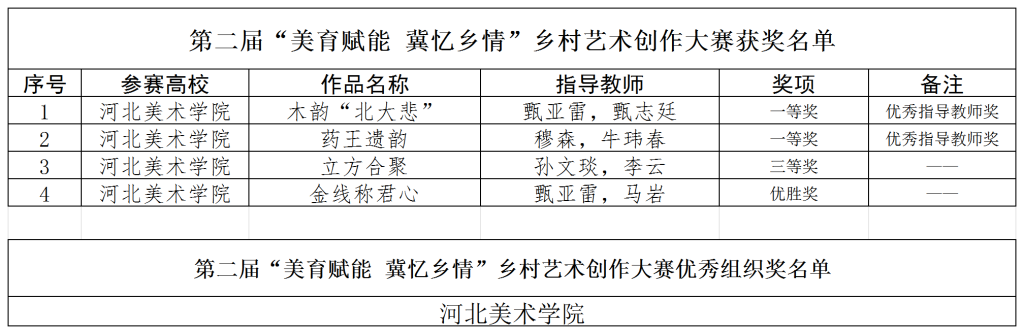 近日,河北省教育厅第二届“美育赋能·冀忆乡情”乡村艺术创作大赛结果揭晓。我校师生成绩斐然,共荣获一等奖2项、三等奖1项、优胜奖1项,2名教师获评“优秀指导教师”,学校同时荣获“优秀组织奖”。