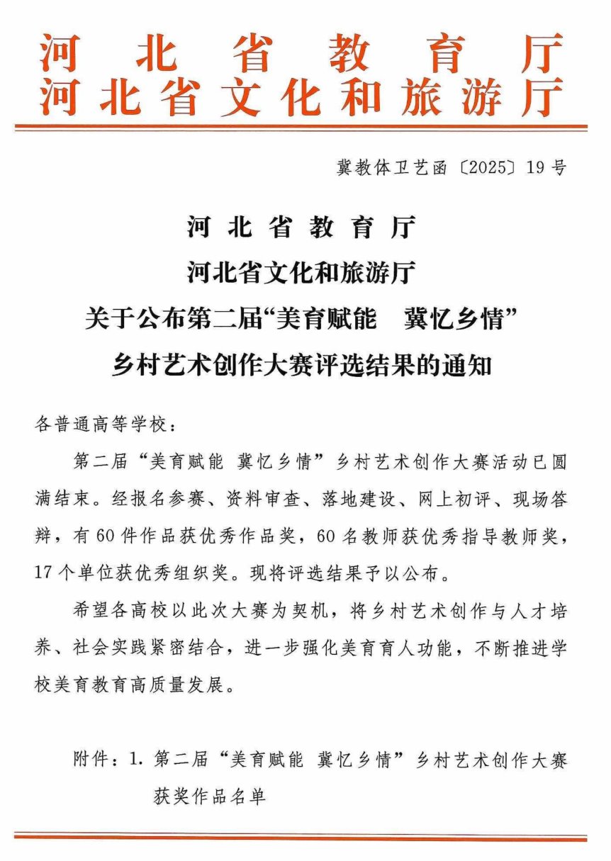 本届大赛旨在以艺术视角展现乡土之美,助力乡村振兴。我校积极响应,组织师生深入乡村采风,创作了一批反映燕赵风情、时代变迁的优质作品。经严格评审,我校多项作品凭借深刻的主题、精湛的技艺和浓郁的生活气息脱颖而出,展现了扎实的艺术功底与深厚的乡土情怀。