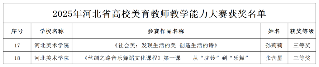 近日,2025年河北省学校美育教师教学能力大赛结果公布。我校选送的孙莉莉、张含星两位教师凭借其富有创新的课程设计,双双荣获三等奖,展现了我校美育教师的扎实功底与探索精神。