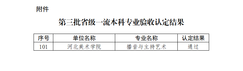 近日,河北省教育厅印发《关于公布第三批省级一流本科专业验收认定结果的通知》(冀教高函〔2026〕11号),公布了2021年度立项建设的认定结果,我校播音与主持艺术专业顺利通过验收认定。至此,学校书法学、环境设计、动画、雕塑、广播电视编导、播音与主持艺术6个专业全部验收认定为省级一流本科专业。